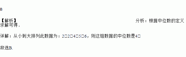 一组数据2, 6, 2, 5, 4,,则这组数据的中位数是( )