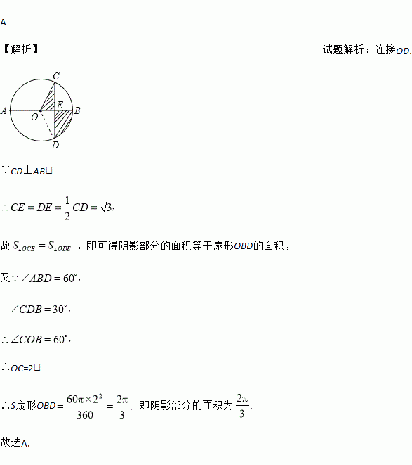 如图,AB是⊙O的直径,CD⊥AB,∠ABD=60°,CD=2,则阴影部分的面积为( )