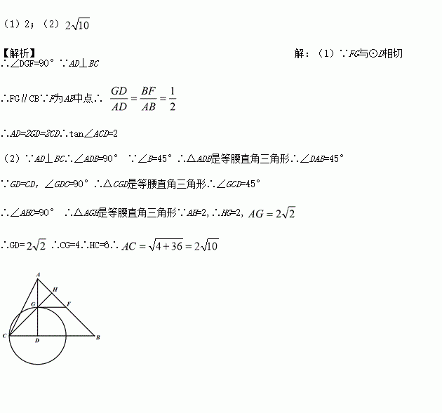 如图,在△ABC中,∠B=45°,AD⊥BC于点D,以D为圆心DC为半径作⊙D交AD于点G,过点G作⊙D的切线交AB于点F,且F恰好为AB中点.