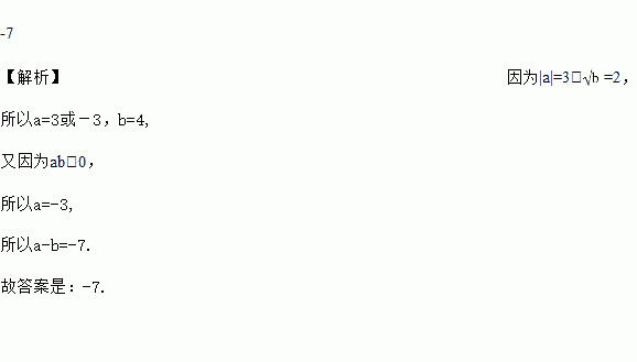 已知|a|=3,=2,且ab<0,则a﹣b=_____.