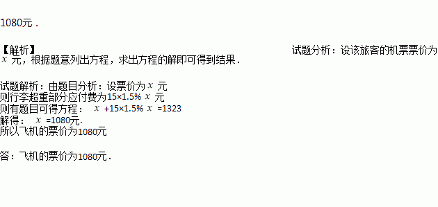 民航规定:乘坐飞机普通舱旅客一人最多可免费携带20千克行李,超过部分每千克按飞机票价的1.5%购买行李票。一名旅客带了35千克行李乘机,机票连同行李费共付了1323元,求该旅客的机票票价.