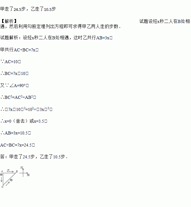 点出发,甲的速度为7,乙的速度为3.乙一直向东走,甲先向南走10步,后又斜向北偏东方向走了一段后与乙相遇.那么相遇时,甲、乙各走了多远?