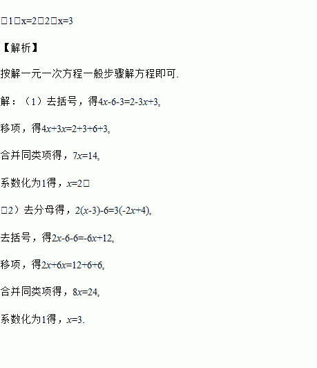 解方程:(1)2(2x﹣3)﹣3=2﹣3(x﹣1) (2).