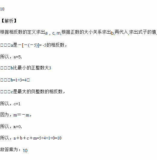已知a是-[-(-5)]的相反数,b比最小的正整数大3,c是最大的负整数的相反数,且m=-m,则a+b+c+m的值为____.