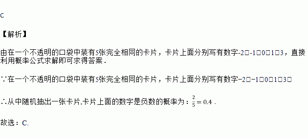 在一个不透明的口袋中装有5张完全相同的卡片,卡片上面分别写有数字-2、-1、0、1、3,从中随机抽出一张卡片,卡片上面的数字是负数的概率为( )