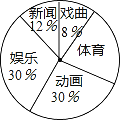为了解全校学生对新闻,体育.动画、娱乐、戏曲五类电视节目的喜爱情况,机调查了100名学生,结果如扇形图所示,依据图中信息,回答下列问题: