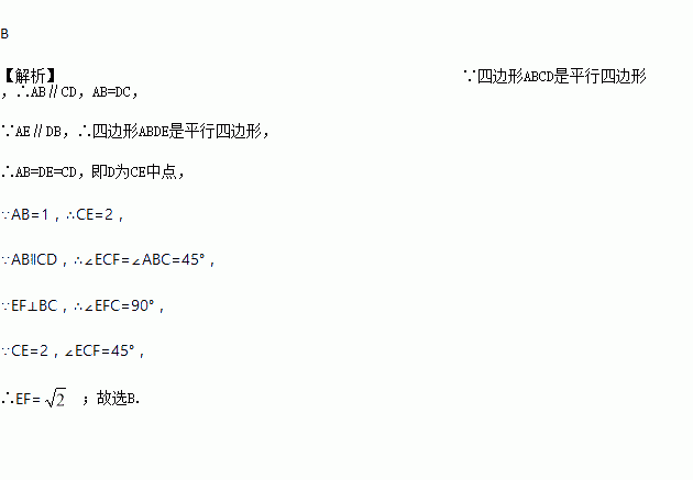 如图,平行四边形ABCD中,∠ABC=45°,E、F分别在CD和BC的延长线上,AE//BD,EF⊥BC,AB=1,则EF的长是( )