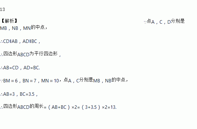 如图,在△MBN中,已知:BM=6,BN=7,MN=10,点A,C,D分别是MB,NB,MN的中点,则四边形ABCD的周长是_____.