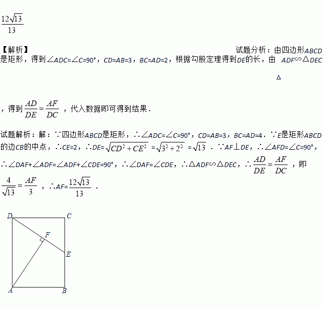如图,E是矩形ABCD的边CB的中点,AF⊥DE于点F,AB=3,AD=4.求点A到直线DE的距离.