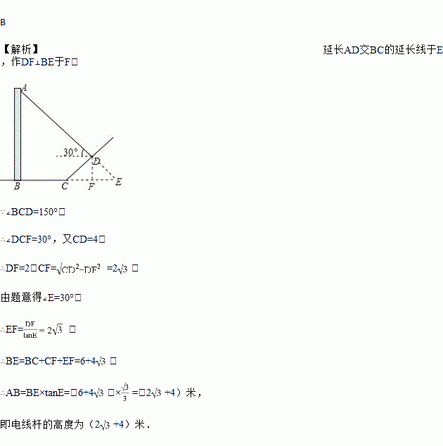 BC、CD,测得 BC=6 米,CD=4 米,∠BCD=150°,在 D 处测得电线杆顶端 A 的仰 角为 30°,则电线杆 AB 的高度为( )