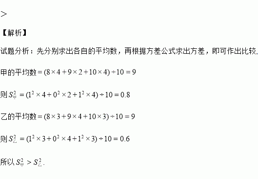 下面是甲、乙两人10次射击成绩(环数)的条形统计图,则这两人10次射击命中环数的方差