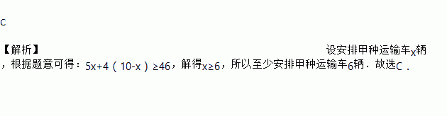 现用 甲、乙两种运输车将46吨抗旱物资运往灾区,甲种运输车载重5吨,乙种运输车载重4吨,安排车辆不超过10辆,则甲种运输车至少应安排( ) .
