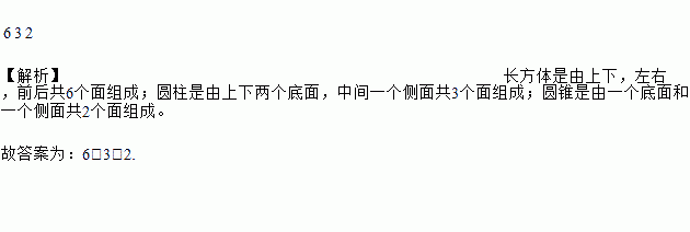 长方体是由______个面围成,圆柱是由______个面围成,圆锥是由_______个面围成.