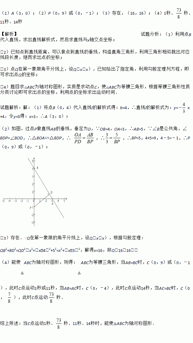 (4)动点C从y轴上的点(0,10)出发,以每秒1cm的速度向y轴负半轴方向运动,求出点C运动中所有可能的时间t值,使得△ABC为轴对称图形.