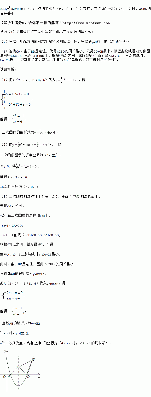 x2+bx+c的图象交x轴于A、D两点,并经过B点,已知A点坐标是(2,0),B点坐标是(8,6).