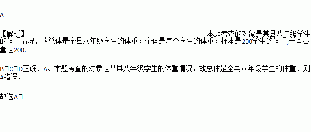 为了了解某县八年级学生的体重情况,从中抽取了200名学生进行体重测试 .在这个问题中,下列说法错误的是( )