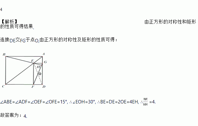 如图,在正方形ABCD中,E是对角线AC上一点,EG⊥AD,EF⊥CD,BE的延长线与FG交于点H,若∠ABE=15°,则的值为___________.