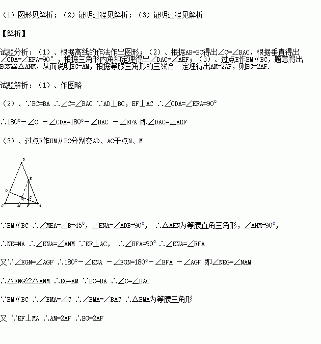 (1)尺规作图:过点A作AD⊥BC于点D(保留作图痕迹,不写作法);(2)求证:∠CAD=∠AEF;(3)若∠ABC=45°,AD与EF交于点G,求证:EG=2AF.