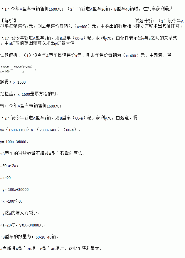 (1)今年A型车每辆售价多少元?(用列方程的方法解答)