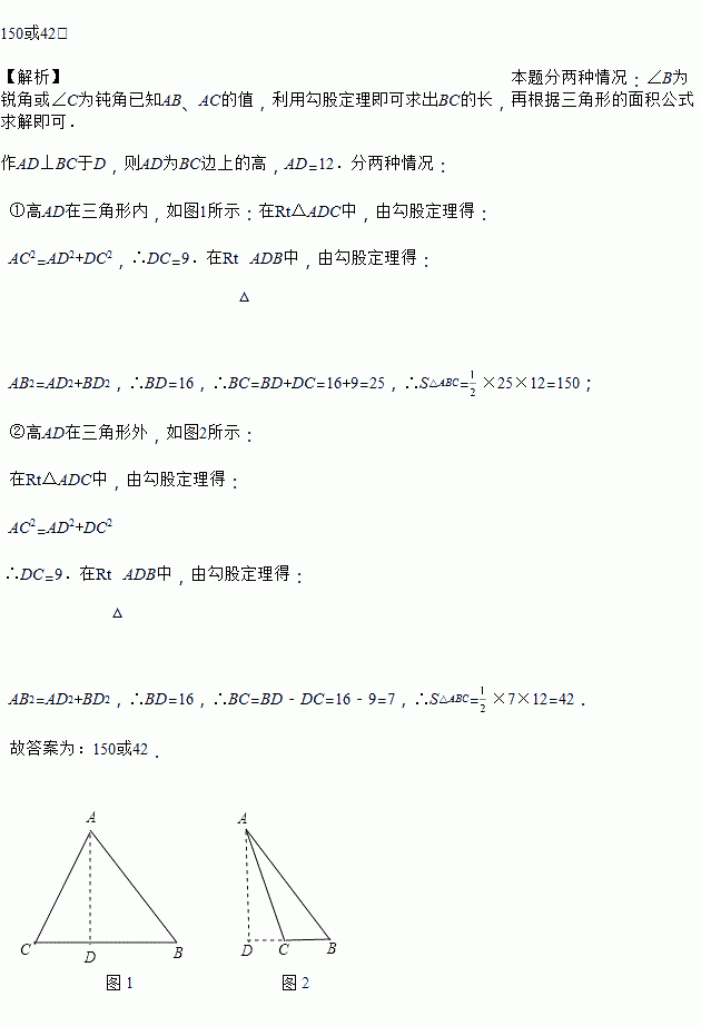 已知△ABC中,AB=20,AC=15,BC边上的高为12,求△ABC的面积.