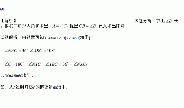 如图,上午9时,一条船从A处出发,以20海里/时的速度向正北航行,12时到达B处,测得∠NAC=36°,∠ABC=108°,求从B处到灯塔C的距离.