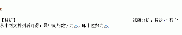 B 【解析】试题分析:将这7个数字从小到大排列后可得:最中间的数字为25,即中位数为25.