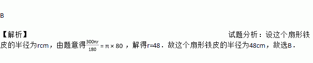 B 【解析】试题分析:设这个扇形铁皮的半径为rcm,由题意得,解得r=48.故这个扇形铁皮的半径为48cm,故选B.