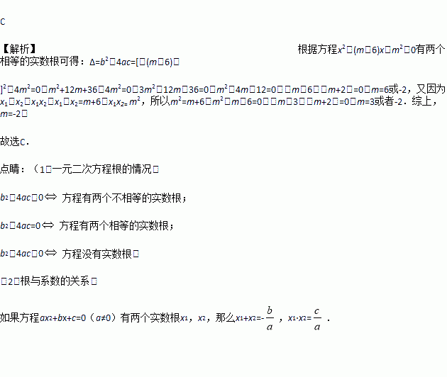方程x2-(m+6)x+m2=0有两个相等的实数根,且满足x1+x2=x1x2,则m的值是( )
