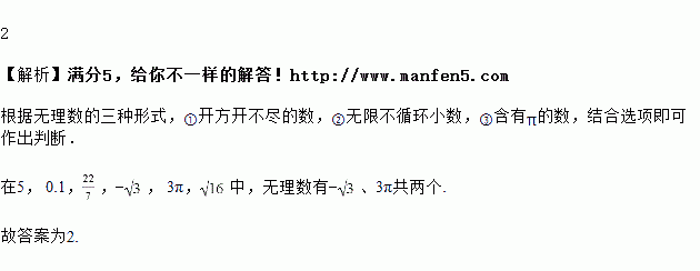 在5, 0.1,,, 3π,中,无理数有______ 个.