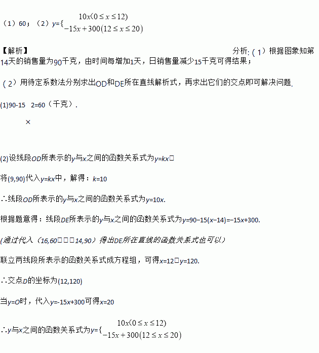 小明家今年种植的“夏黑”葡萄喜获丰收,采摘上市后若干天便全部销完.小明对销售情况进行了跟踪记录,并将记录情况绘成图象,图中的折线ODE表示日销售量y(千克)与上市时间x(天)之间的函数关系,已知线段DE表示的函数关系中,时间每增加1天,日销售量减少15千克.