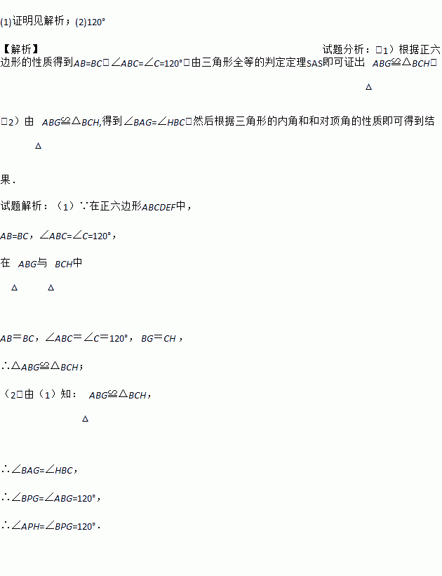 如图,点G,H分别是正六边形ABCDEF的边BC,CD上的点,且BG=CH,AG交BH于点P.