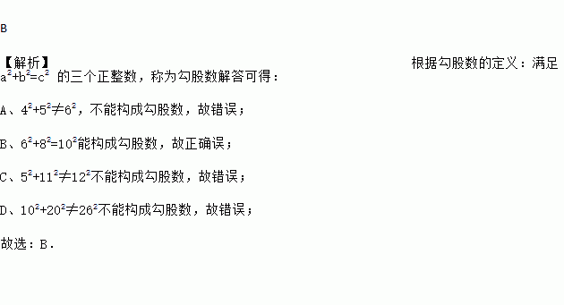 B 【解析】根据勾股数的定义:满足a2+b2=c2 的三个正整数,称为勾股数解答可得: A、42+52≠62,不能构成勾股数,故错误; B、62+82=102能构成勾股数,故正确误; C、52+112≠122不能构成勾股数,故错误; D、102+202≠262不能构成勾股数,故错误; 故选:B.