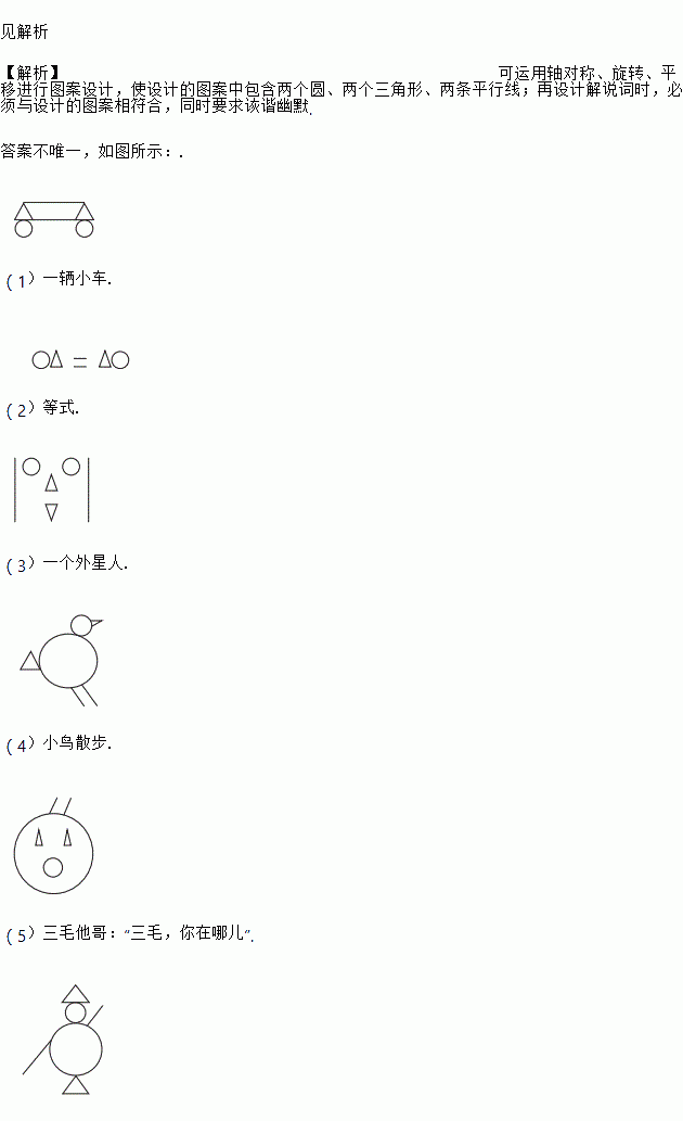 明明在办手抄报的时候,他想用图形“○○、△△、=”(两个圆、两个三角形、两条平行线)为构件,构思具有一定意义的图形,他在图中左边方框中已经设计好了一个,你还能构思出其他的图形吗?请你在图中的右框中画出一个与之不同的图形,并写出一两句贴切、诙谐的解说词.