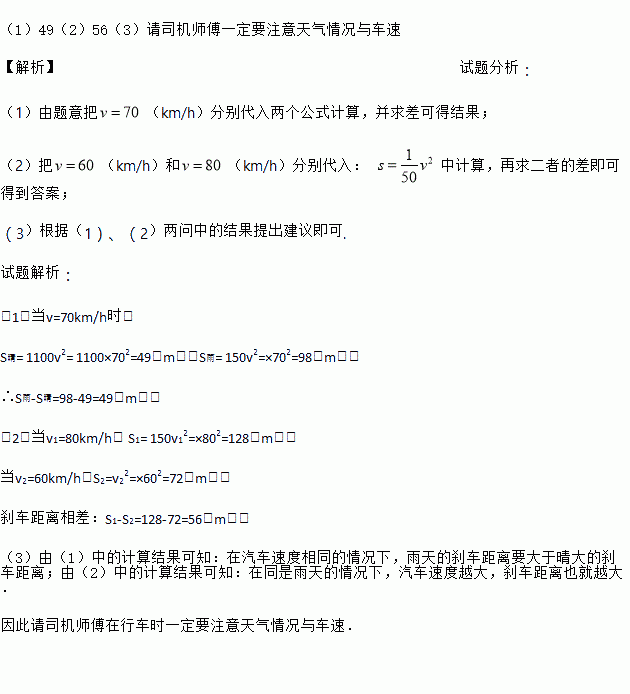 £¨1£©49£¨2£©56£¨3£©Çë˾»úʦ¸µÒ»¶¨Òª×¢ÒâÌìÆøÇé¿öÓë³µËÙ ¡¾½âÎö¡¿ÊÔÌâ·ÖÎö£º £¨1£©ÓÉÌâÒâ°Ñ£¨km/h£©·Ö±ð´úÈëÁ½¸ö¹«Ê½¼ÆË㣬²¢Çó²î¿ÉµÃ½á¹û£» £¨2£©°Ñ£¨km/h£©ºÍ£¨km/h£©·Ö±ð´úÈ룺 ÖмÆË㣬ÔÙÇó¶þÕߵIJ¿ÉµÃµ½´ð°¸£» £¨3£©¸ù¾Ý£¨1£©¡¢£¨2£©Á½ÎÊÖеĽá¹ûÌá³ö½¨Òé¼´¿É. ÊÔÌâ½âÎö£º £¨1£©µ±v=70km/hʱ£¬ SÇç= 1100v2= 1100¡Á...