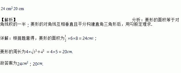 菱形ABCD的两条对角线长分别为6cm和8cm,则菱形ABCD的面积为_____;周长为______.