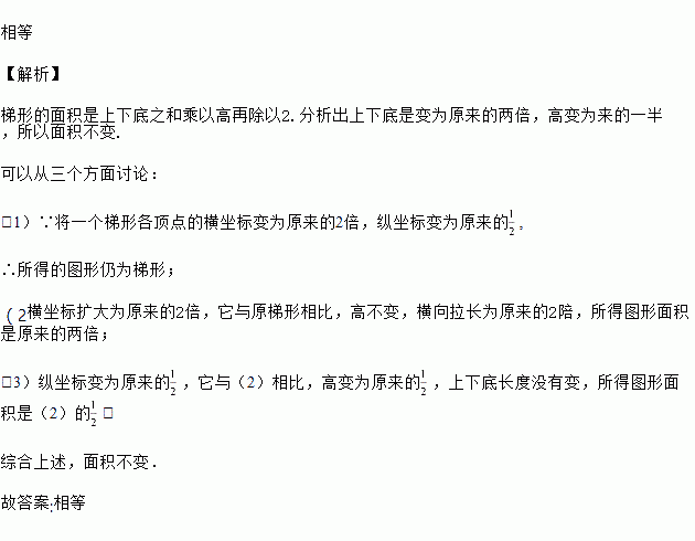 将一梯形的各顶点的横坐标变为原来的2倍,纵坐标变为原来的 ,则所得图形的面积与原来图形的面积_____________.