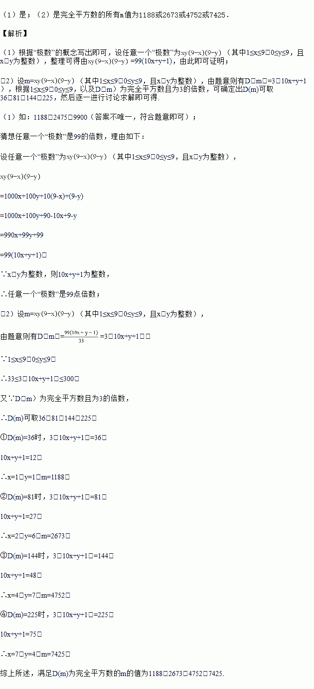 (2)如果一个正整数a是另一个正整数b的平方,则称正整数a是完全平方数.若四位数m为“极数”,记D(m)=