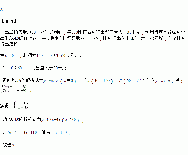 某水果超市以每千克3元的价格购进某种水果若干千克,销售一部分后,根据市场行情降价销售,销售额 y(元)与销售量x(千克)之间的关系如图所示.若该水果超市销售此种水果的利润为110元,则销售量为( )
