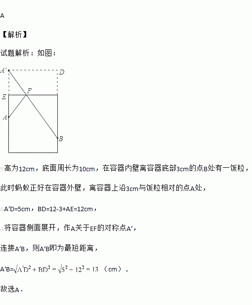 如图,透明的圆柱形容器(容器厚度忽略不计)的高为12cm,底面周长为10cm,在容器内壁离容器底部3cm的点B处有一饭粒,此时一只蚂蚁正好在容器外壁,且离容器上沿3cm的点A处,则蚂蚁吃到饭粒需爬行的最短路径是( )