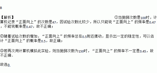 B ¡¾½âÎö¡¿¢Ùµ±Å×ÖÀ´ÎÊýÊÇ100ʱ£¬¼ÆËã»ú¼Ç¼¡°ÕýÃæÏòÉÏ¡±µÄ´ÎÊýÊÇ47£¬ÒòÊÔÑé´ÎÊý±È½ÏÉÙ£¬ËùÒÔÖ»ÄÜ˵¡°ÕýÃæÏòÉÏ¡±µÄƵÂÊÊÇ0.47£¬²»ÄÜ˵¸ÅÂÊÊÇ0.47£¬¹Ê²»ÕýÈ·£» ¢ÚËæ×ÅÊÔÑé´ÎÊýµÄÔö¼Ó£¬¡°ÕýÃæÏòÉÏ¡±µÄƵÂÊ×ÜÔÚ0.5¸½½ü°Ú¶¯£¬ÏÔʾ³öÒ»¶¨µÄÎȶ¨ÐÔ£¬¿ÉÒÔ¹À¼Æ¡°ÕýÃæÏòÉÏ¡±µÄ¸ÅÂÊÊÇ0.5£¬¹ÊÕýÈ·£» ¢ÛÈôÔÙ´ÎÓüÆËã»úÄ£Äâ´ËʵÑ飬Ôòµ±Å×ÖÀ´ÎÊýΪ150ʱ£¬¡°ÕýÃæÏòÉÏ¡±µÄƵÂʲ»Ò»¶¨ÊÇ0.45£¬¹Ê²»...