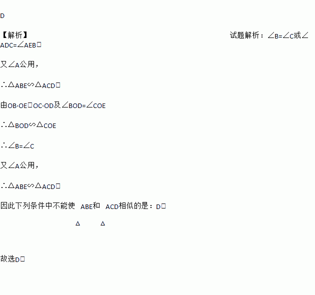 如图,D、E分别是AB、AC上两点,CD与BE相交于点O,下列条件中不能使△ABE和△ACD相似的是( )