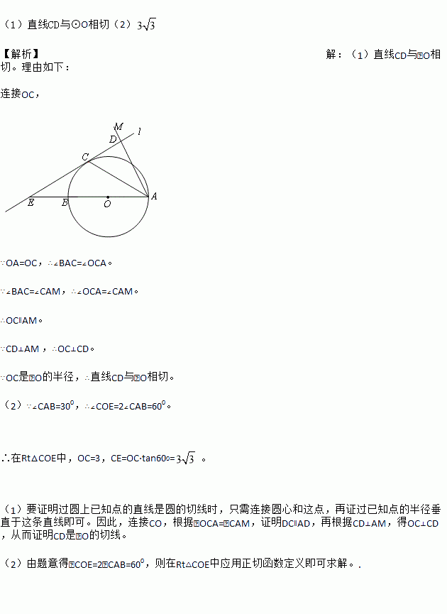(2)若直线l与AB的延长线相交于点E,⊙O的半径为3,并且∠CAB=30°,求CE的长.