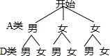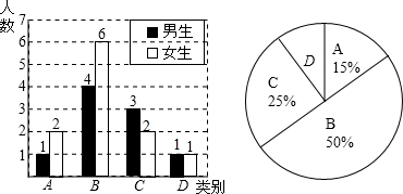 分析:(1)利用B类的学生数÷所占百分比可得调查的学生总数;利用总数×C类学生所占百分比-3可得C类女生人数;算出D类学生总数-1即可得到D类男生人数;
