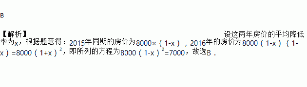 B 【解析】设这两年房价的平均降低率为x,根据题意得:2015年同期的房价为8000×(1-x),2016年的房价为8000(1-x)(1-x)=8000(1+x)2,即所列的方程为8000(1-x)2=7000,故选B.