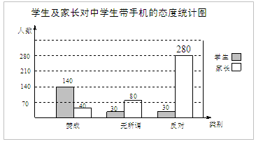 “校园手机”现象越来越受到社会的关注,小记者刘凯随机调查了某校若干学生和家长对中学生带手机现象的看法,制作了如下的统计图:![]()