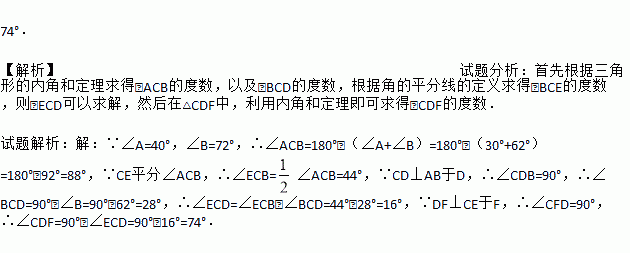 如图,△ABC中,∠A=30°,∠B=62°,CE平分∠ACB,CD⊥AB于D,DF⊥CE于F,求∠CDF的度数.