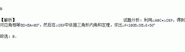 已知△ABC≌△DEF,∠A=80°,∠E=50°,则∠F的度数为( ).