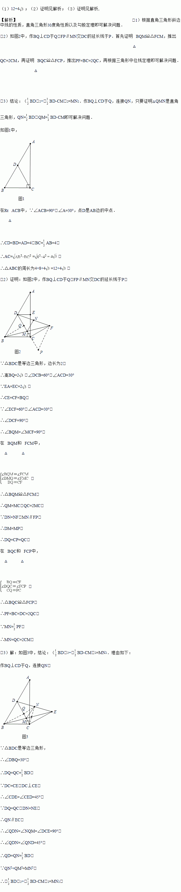 (3)如图3,以C为旋转中心将线段CD顺时针旋转90°,使点D至点E处,连接BE交CD于M,连接DE,取DE的中点N,连接交MN,试猜想BD、MN、MC之间的关系,直接写出其关系式,不证明.