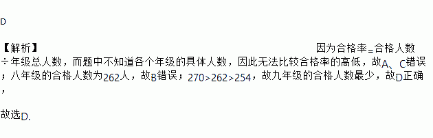 D 【解析】因为合格率=合格人数÷年级总人数,而题中不知道各个年级的具体人数,因此无法比较合格率的高低,故A、C错误;八年级的合格人数为262人,故B错误;270>262>254,故九年级的合格人数最少,故D正确, 故选D.