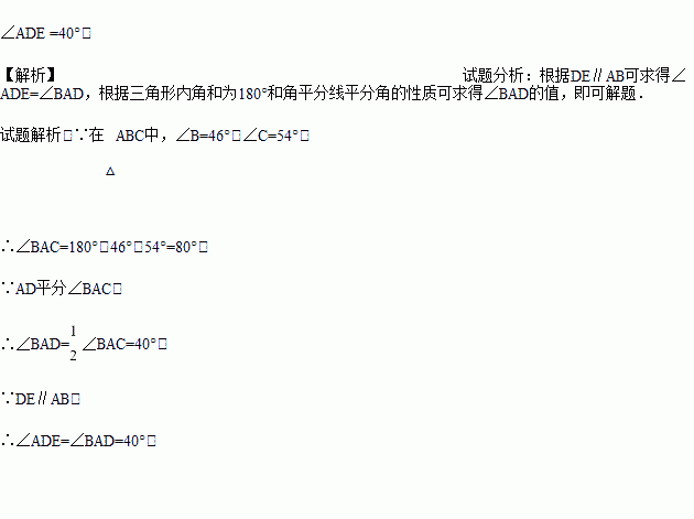 如图,在△ABC中,∠B=46°,∠C=54°,AD平分∠BAC,交BC于D,DE∥AB,交AC于E,则∠ADE的大小是多少?